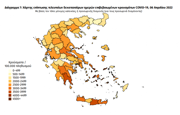 Ο χάρτης αποτυπώνει τη γεωγραφική κατανομή των κρουσμάτων COVID-19 των τελευταίων 14 ημερών ανά Περιφερειακή Ενότητα της χώρας, με βάση την δηλωθείσα διεύθυνση μόνιμης κατοικίας του ασθενούς, ή τη διεύθυνση προσωρινής διαμονής για τους τουρίστες και άλλους προσωρινά διαμένοντες στην Ελλάδα. Συμπεριλαμβάνονται τόσο κρούσματα με ιστορικό ταξιδίου (“εισαγόμενα”) όσο και κρούσματα με πιθανή εγχώρια μετάδοση.