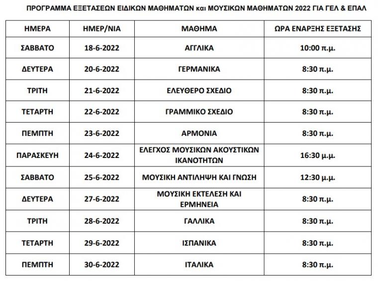 Τον καθορισμό του προγράμματος των Πανελλαδικών Εξετάσεων των Ειδικών Μαθημάτων και των Μουσικών Μαθημάτων για εισαγωγή των υποψηφίων σε Τμήματα και Σχολές της Τριτοβάθμιας Εκπαίδευσης, για τα οποία απαιτείται εξέταση σε αυτά, ως ακολούθως: