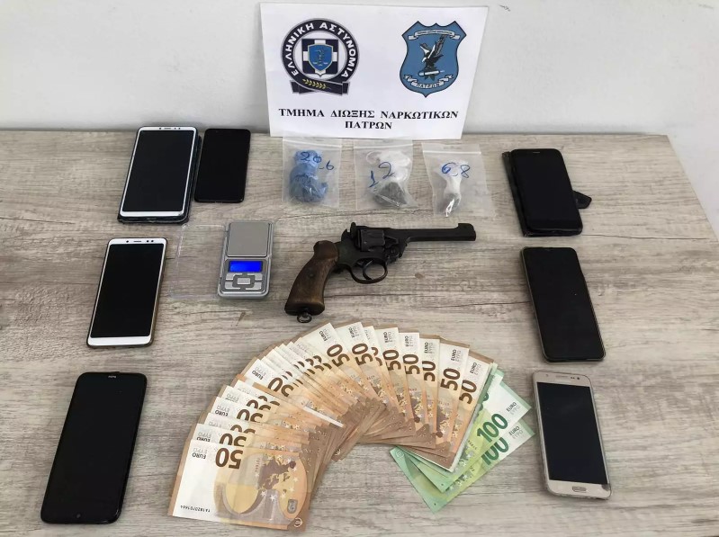 Ένα περίστροφο, οκτώ κινητά τηλέφωνα, 2.245 ευρώ, 39,4 γραμμάρια ηρωίνης, μικροποσότητα βουπρενορφίνης, μια ηλεκτρονική ζυγαριά ακριβείας, μία ατζέντα & μία σελίδα τετραδίου με ιδιόχειρες σημειώσεις, αλλά και δύο οχήματα.