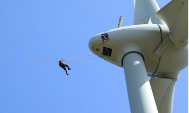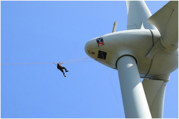 Το αποκορύφωμα της ημερίδας ήταν η άσκηση διάσωσης, η οποία προσομοίωσε τον εγκλωβισμό στην άτρακτο του προσωπικού συντήρησης της ανεμογεννήτριας, σε μεγάλο υψόμετρο λόγω έκτακτης ανάγκης και πραγματοποιήθηκε η διάσωση με επιτυχία. Η όλη διαδικασία χωρίστηκε σε δύο μέρη. Το πρώτο μέρος ήταν η ασφαλής μεταφορά του εγκλωβισμένου ατόμου με φορείο διάσωσης από την άτρακτο ύψους 70 μέτρων, στο έδαφος. Το δεύτερο μέρος ήταν μια διάσωση ατόμου με τη χρήση σχοινιών για την μεταφορά του με ασφάλεια από την καταπακτή της ατράκτου στο έδαφος. Η όλη διαδικασία οργανώθηκε μεθοδικά και εκτελέστηκε άψογα, γεγονός που κατέδειξε την ικανότητα χειρισμού και συντονισμού στην αντιμετώπιση μιας έκτακτης ανάγκης της ομάδας υποστήριξης του αιολικού πάρκου και της 4ης ΕΜΑΚ. Μετά το πέρας της άσκησης, οι επισκέπτες χειροκρότησαν τα μέλη της ομάδας έκτακτης ανάγκης της 4ης ΕΜΑΚ. Οι μαθητές του δημοτικού σχολείου που παρακολούθησαν την άσκηση είπαν ότι η διαδικασία ήταν συναρπαστική και εκπληκτική.