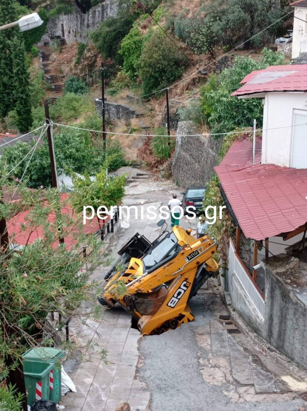 Ο δρόμος ξαφνικά άνοιξε και «κατάπιε» το JCB. Από θαύμα δεν τραυματίστηκε ο χειριστής-οδηγός του μηχανήματος.