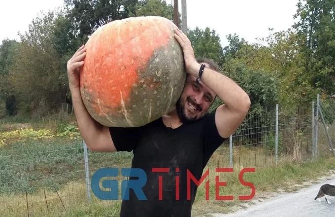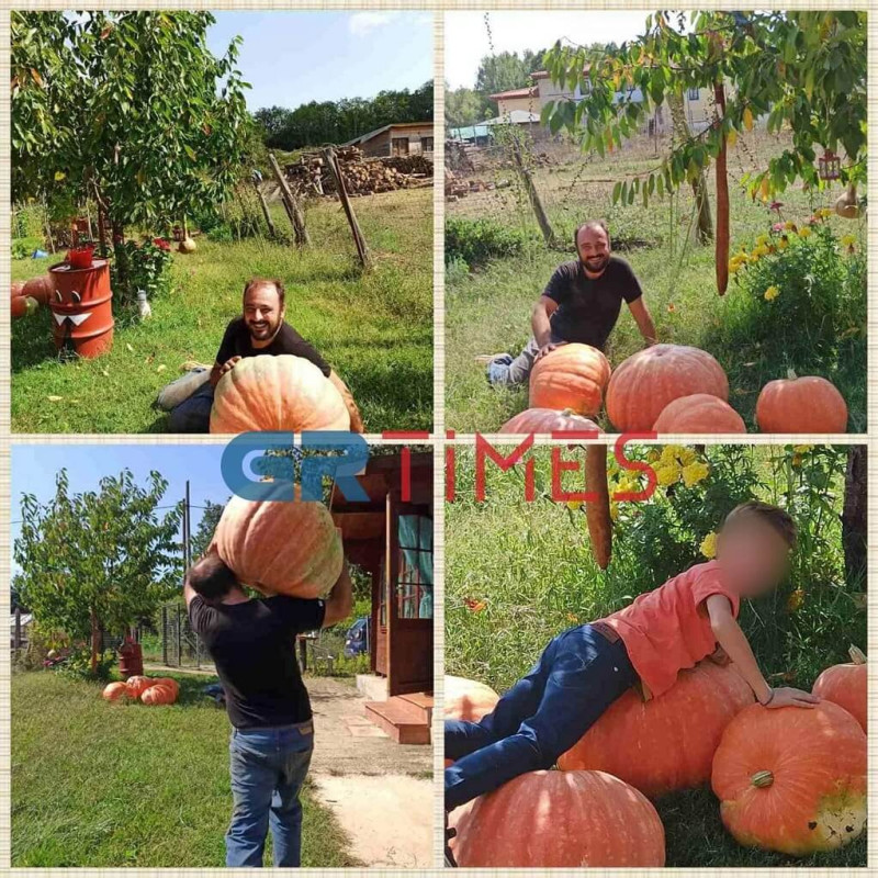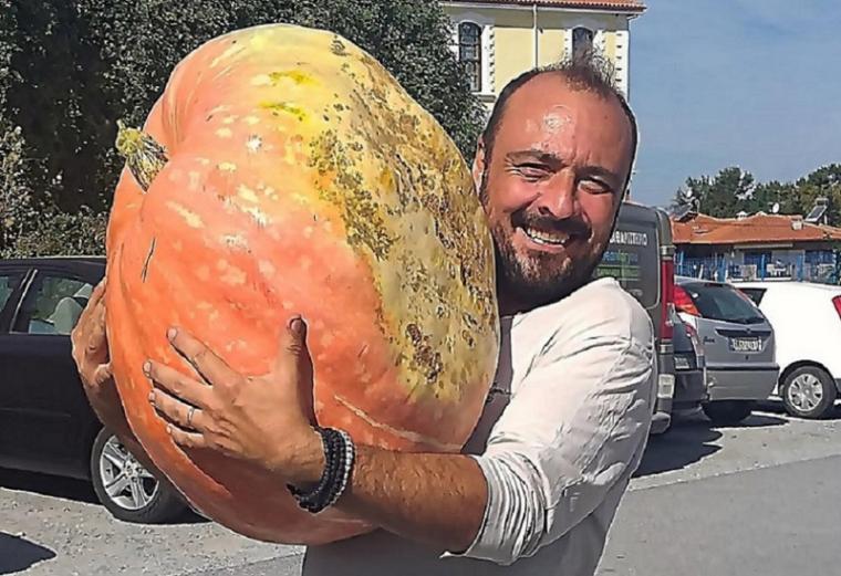 Πρόσφατα ο ερασιτέχνης κηπουρός έκοψε από τον κήπο του μια κολοκύθα πάνω από 50 κιλά, την οποία όπως διακρίνεται και στη φωτογραφία, με δυσκολία καταφέρει να συγκρατήσει.