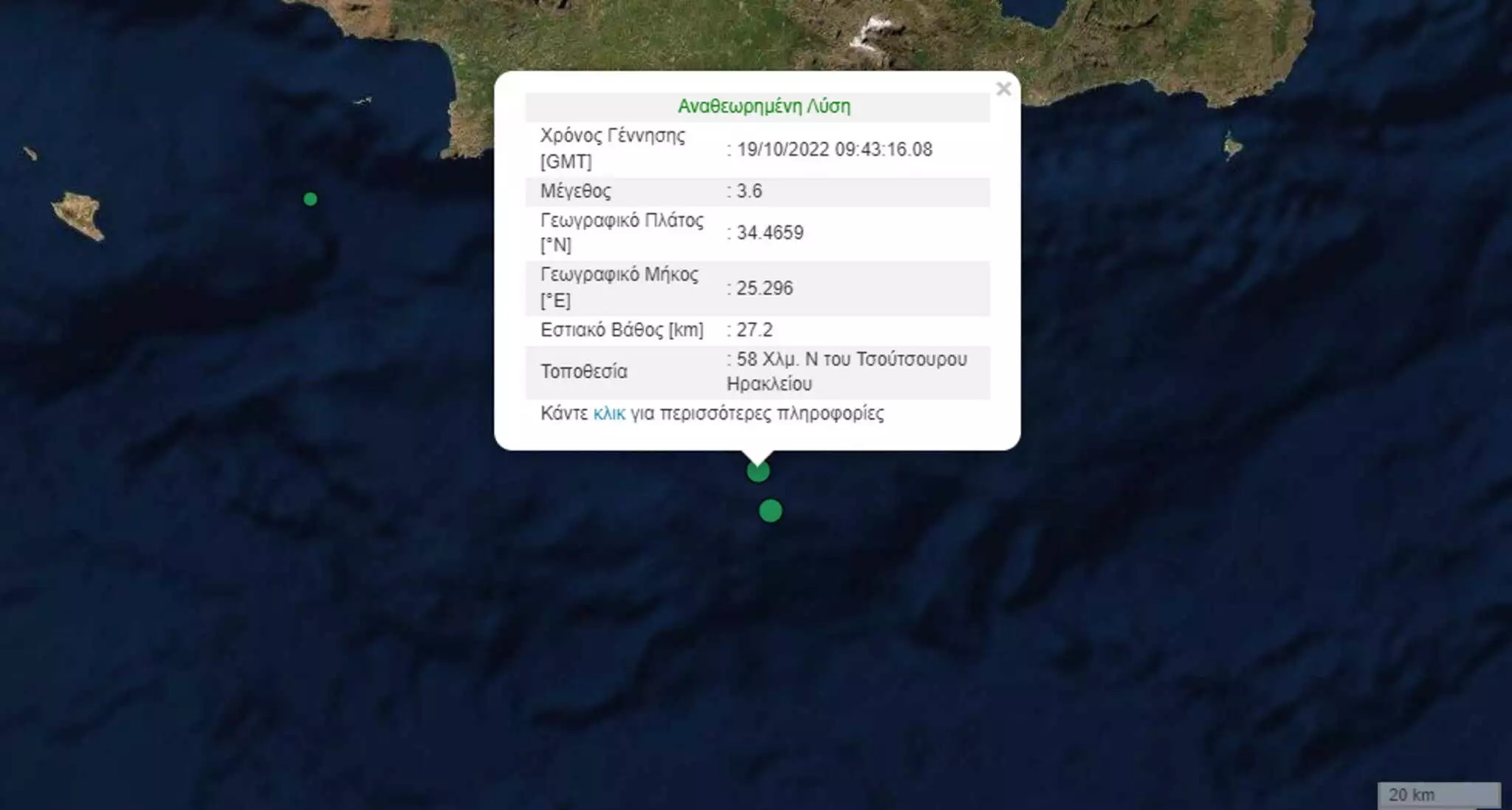 Το επίκεντρο της σεισμικής δόνησης βρίσκεται σε απόσταση 58 χιλιομέτρων νότια του Τσούτσουρου Ηρακλείου Κρήτης.