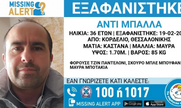 Συναγερμός έχει σημάνει στις Αρχές της Θεσσαλονίκης για την εξαφάνιση ενός 36χρονου άνδρα. Στις 19/02/2023, πρωινές ώρες, εξαφανίστηκε από την περιοχή του Κορδελιού Θεσσαλονίκης, ο Μπάλλα (επ.) Άντι (ον.), 36 ετών, αλβανικής καταγωγής.