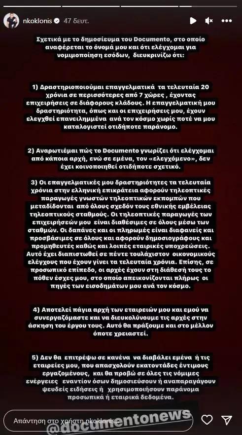 Σε ανάρτηση του στο Instagram ο γνωστός παρουσιαστής και παραγωγός, Νίκος Κοκλώνης, απαντά σε δημοσίευμα που τον εμπλέκει σε υπόθεση που ερευνά η Αρχή για το Ξέπλυμα Μαύρου Χρήματος.