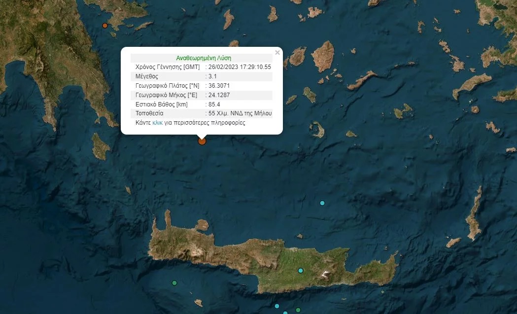 Η δόνηση ήταν μεγέθους 3,1 βαθμών της κλίμακας Ρίχτερ, και το επίκεντρο εντοπίστηκε σε απόσταση 55 χιλιομέτρων νότια – νοτιοδυτικά της Μήλου, στα 85,4 χιλιόμετρα βάθος.