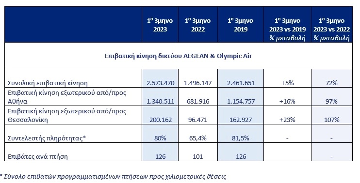 Με την συνολική επιβατική κίνηση της Aegean Airlines για το 1ο τρίμηνο του έτους 72% υψηλότερα από το 2022 (2,6 εκατ. επιβάτες) άλλα και για πρώτη φορά να ξεπερνά την αντίστοιχη του 2019 (+5% αύξηση), και την επιβατική κίνηση εξωτερικού από τα δυο μεγαλύτερα αεροδρόμια της χώρας (Αθήνα, Θεσσαλονίκη) να καταγράφει σχεδόν διπλασιασμό (+ 98%) και σημαντική αύξηση +17% από το 2019, ολοκληρώθηκε η χειμερινή περίοδος αντικατοπτρίζοντας την επένδυση της εταιρείας στο πιο αδύναμο τρίμηνο του έτους, αλλά και τις θετικές προοπτικές για τη ζήτηση προς τη χώρα, πριν ακόμη από το ξεκίνημα της κύριας τουριστικής περιόδου.