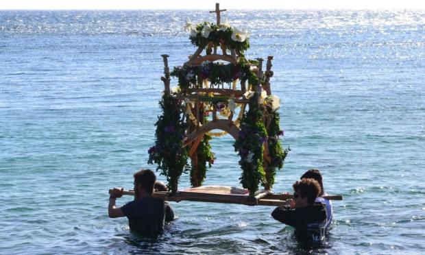 Ο Επιτάφιος είναι φτιαγμένος από ξύλα και στολισμένος ελάχιστα, την ώρα που τον συνοδεύουν οι ψαλμωδίες των πιστών, στην περιφορά του, εντός της θάλασσας.