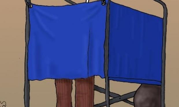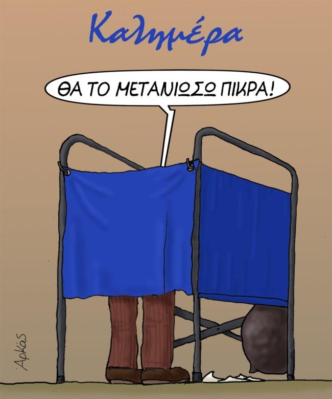 Στο νέο σκίτσο του Αρκά βλέπουμε τον ψηφοφόρο μέσα στο παραβάν, την ώρα που ψηφίζει, να λέει: "Θα το μετανιώσω".