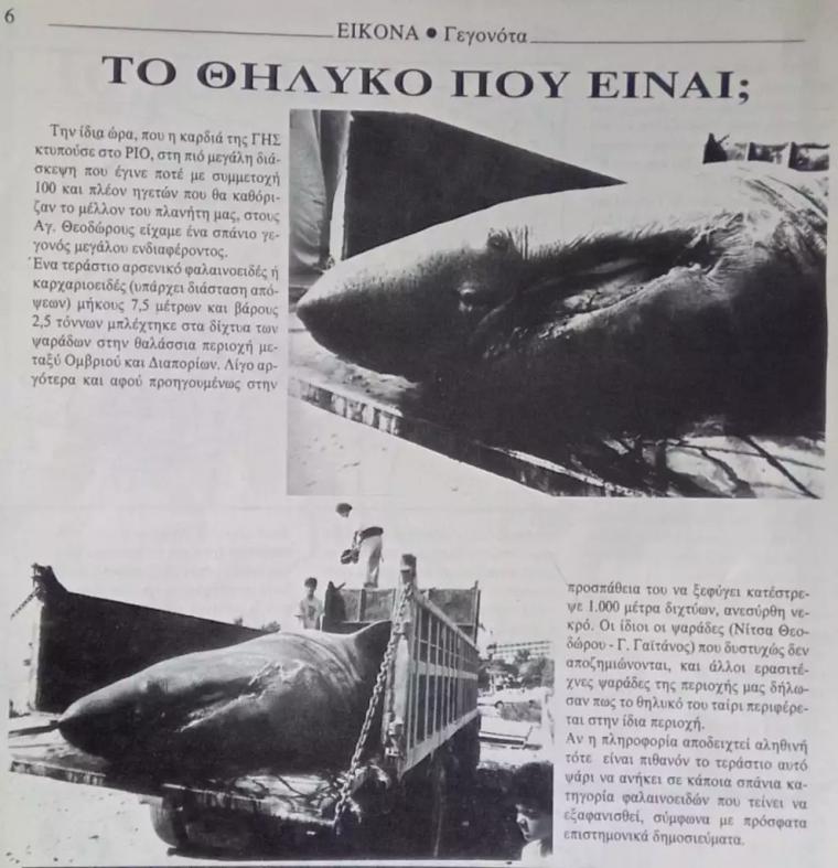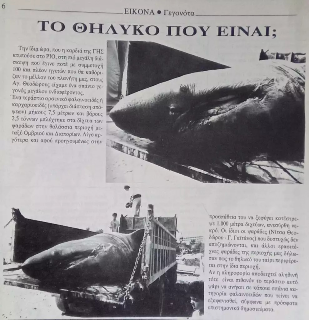Ήταν 2 Ιουνίου του 1992, όταν ντόπιοι ψαράδες ήρθαν αντιμέτωποι με ένα θαλάσσιο κήτος (καρχαριοειδές) στα βαθιά μεταξύ των νησίδων Ομβριού και Διαπόρια.