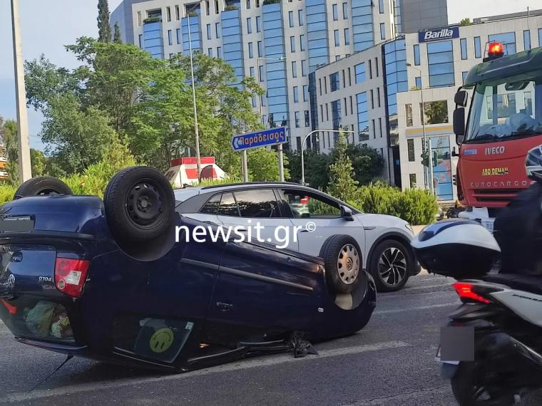 Το ΙΧ της αναποδογύρισε υπό αδιευκρίνιστες μέχρι στιγμής συνθήκες όταν ξέφυγε από την πορεία του και κατέληξε ανάποδα στο οδόστρωμα. Ένα ακόμα ΙΧ έχει υποστεί ζημιές.