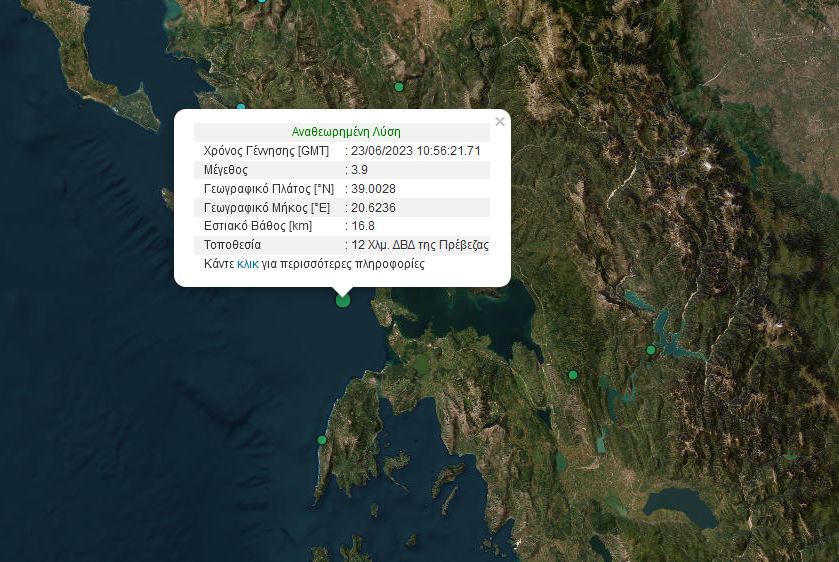 Η δόνηση ήταν μεγέθους 3,9 βαθμών της κλίμακας Ρίχτερ και το επίκεντρο, σύμφωνα με το Γεωδυναμικό Ινστιτούτο, εντοπίζεται 12 χλμ. δυτικά-βορειοδυτικά της Πρέβεζας.