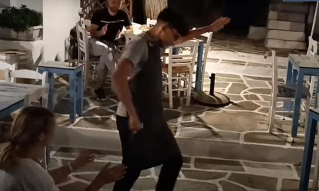 Αυτός όμως που έκλεψε την παράσταση ήταν ο νεαρός σερβιτόρος του εστιατορίου, ο οποίος έκλεψε τις εντυπώσεις με τις χορευτικές του ικανότητες.
