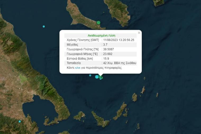 Σεισμική δόνηση σημειώθηκε ανοιχτά της Σκιάθου λίγο μετά τις 16:00 στη θαλάσσια περιοχή του Αιγαίου ανάμεσα σε Σποράδες και Χαλκιδική.