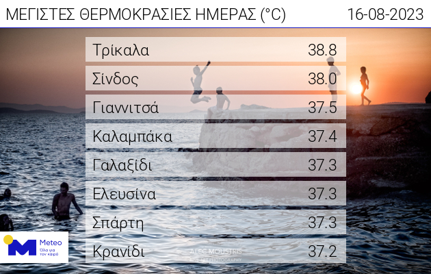 Άνοδο παρουσίασε ο υδράργυρος την Τετάρτη 16/08, πλησιάζοντας τους 39 °C στη Θεσσαλία. Πιο συγκεκριμένα, στα Τρίκαλα η θερμοκρασία στις 16:30 έφτασε τους 38.8 °C. Υψηλές θερμοκρασίες καταγράφηκαν επίσης στην Κεντρική Μακεδονία, στα ανατολικά τμήματα της Στερεάς Ελλάδας και στα ανατολικά και νότια τμήματα της Πελοποννήσου. Στον σχετικό πίνακα παρουσιάζονται οι 8 σταθμοί του δικτύου αυτόματων μετεωρολογικών σταθμών του Εθνικού Αστεροσκοπείου Αθηνών / meteo.gr που κατέγραψαν τις υψηλότερες μέγιστες θερμοκρασίες το μεσημέρι της Τετάρτης 16/08.