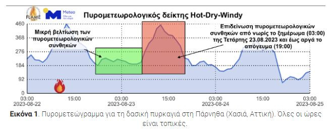 Σε ό,τι αφορά την εξέλιξη των πυρομετεωρολογικών συνθηκών, αυτή τη στιγμή εμφανίζουν μικρή βελτίωση. Ωστόσο, η εξασθένιση των ανέμων υποβοηθά την αλληλεπίδραση της φωτιάς με την τοπογραφία και τη συνέχιση της εξάπλωσης της προς βόρεια-βορειοανατολικά, όπως σημειώθηκε παραπάνω. Από νωρίς το ξημέρωμα (03:00) της Τετάρτης 23.08.2023 αναμένουμε εκ νέου επιδείνωση των πυρομετεωρολογικών συνθηκών, οι οποίες θα παραμείνουν δυσμενείς έως και αργά το απόγευμα (19:00) της ίδιας ημέρας.