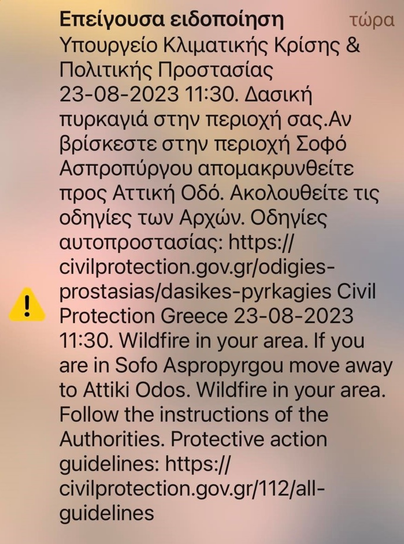 Μήνυμα για την εκκένωση της περιοχής του Σοφού Ασπροπύργου εστάλη στις πολίτες μέσω του 112.