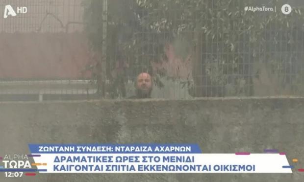 Δραματικό στιγμιότυπο καταγράφηκε σε απευθείας μετάδοση στη συχνότητα του Alpha στην Ντάρδιζα Αχαρνών, όταν ένας κάτοικος φώναζε απεγνωσμένα «βοήθεια» προς τους Πυροσβέστες γιατί έβλεπε να καίγεται το σπίτι του, με τις φλόγες να έχουν φτάσει στην πίσω πλευρά.
