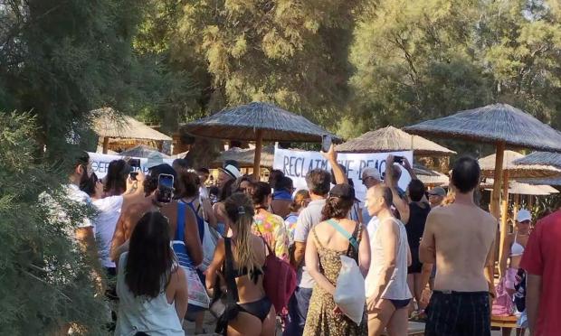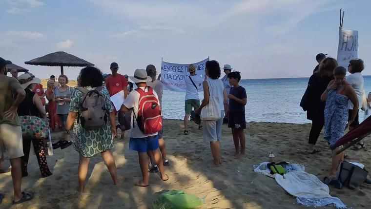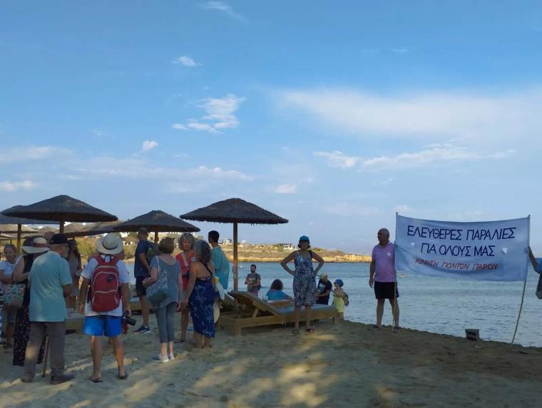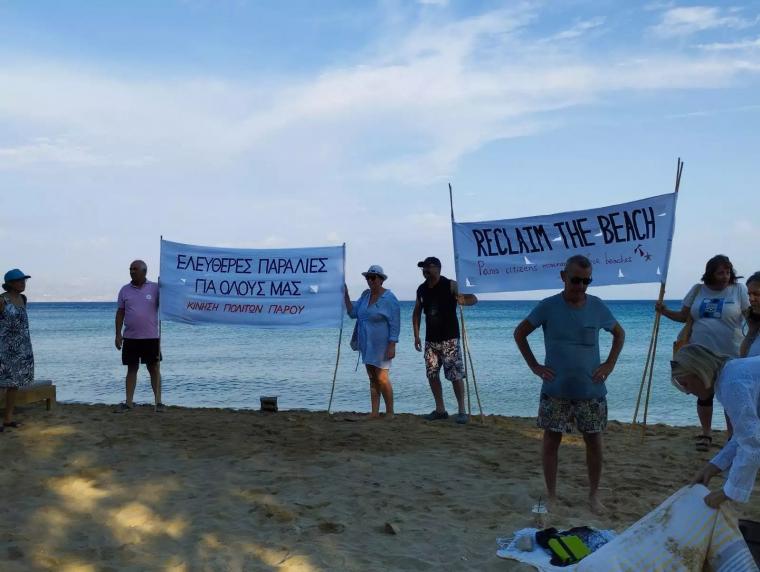 Οι πολίτες που συμμετέχουν στο «Κίνημα της Πετσέτας» πήγαν στην παραλία της Πάρου με πανό, ζητώντας ελεύθερες παραλίες και όχι ξαπλώστρες και καθίσματα επί πληρωμή παντού.