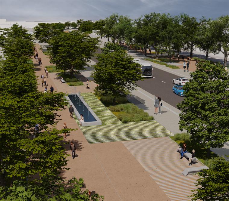 Οι χώροι στους οποίους θα δημιουργηθούν οι κεντρικές πλατείες και τα πλατώματα που θα φιλοξενούν αναψυκτήρια, θα είναι ελάχιστες με έμφαση στη χρήση βιοκλιματικών και φιλικών προς το περιβάλλον υλικών, που χαρακτηρίζονται τόσο από υδατοδιαπερατότητα, όσο και από φυσικότητα.