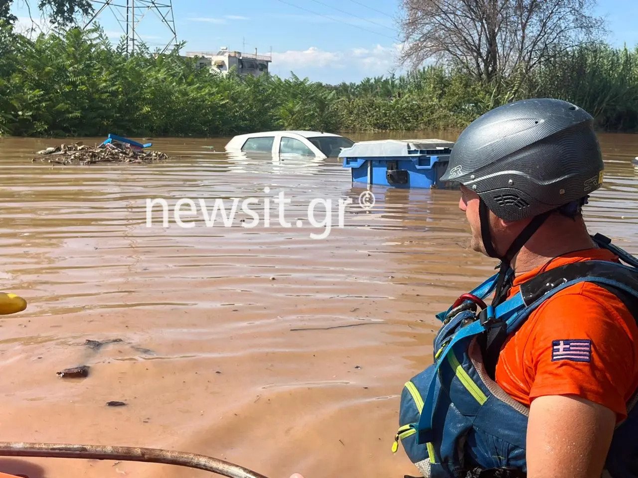 Ακόμα και κολυμπώντας τα μέλη της εθελοντικής ομάδας Ο.Φ.Κ.Α.Θ. τραβούν τις βάρκες έτσι ώστε να βγάλουν σε ασφαλή σημεία τους πλημμυροπαθείς.