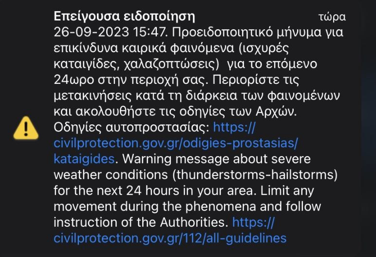 Προειδοποιητικό μήνυμα από το 112 για επικίνδυνα καιρικά φαινόμενα το επόμενο 24ωρο έλαβαν λίγο πριν τις 4 το απόγευμα οι κάτοικοι στην περιοχή της Αχαΐας.