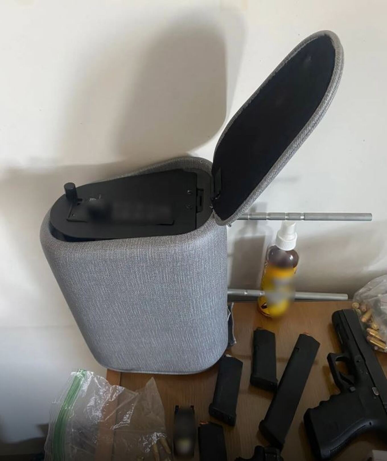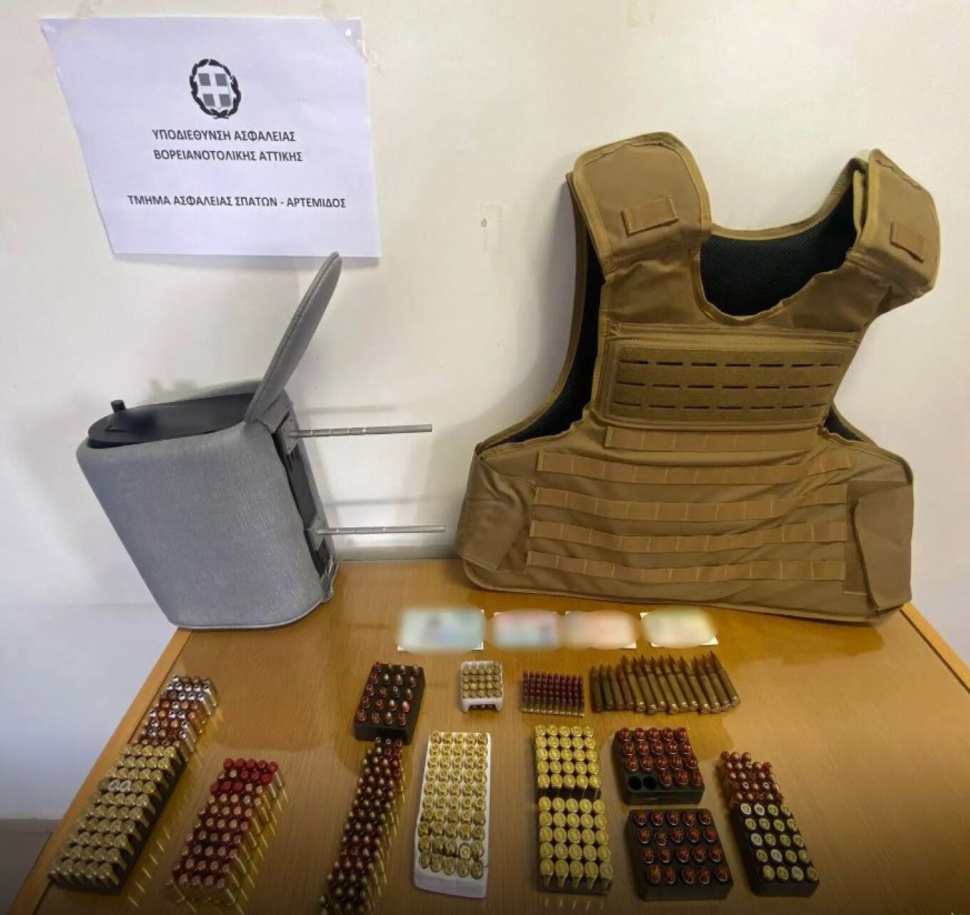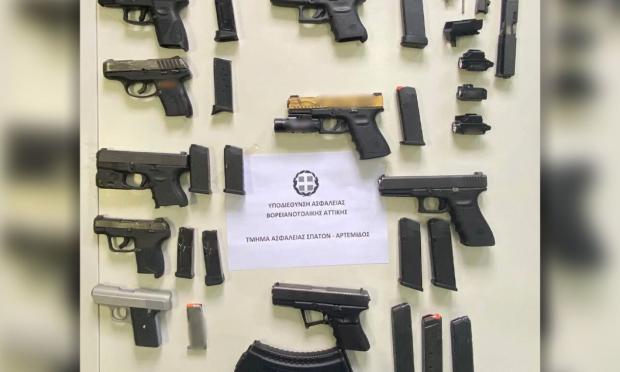 Ειδικότερα, σε έρευνα που έγινε στο σπίτι του, εντοπίστηκαν οκτώ πιστόλια με 12 γεμιστήρες, τρεις φακοί πιστολιών, ένα πλαστικό εξάρτημα όπλου, ένα εξάρτημα όπλου με ελατήριο, μία ολισθήρα με κάννη, μία κάννη, 475 φυσίγγια διαφορετικών διαμετρημάτων και ένα αλεξίσφαιρο γιλέκο με βαλλιστική πλάκα.