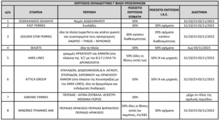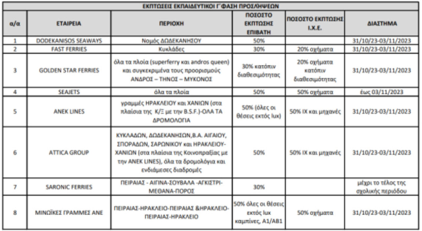 Οι μειώσεις αφορούν στα ακτοπλοϊκά εισιτήρια για τους προσληφθέντες τόσο κατά την Α΄ όσο και κατά τη Β΄ φάση αναπληρωτές εκπαιδευτικούς. Τις επόμενες ημέρες ενδέχεται να προστεθούν και άλλες εταιρείες στον ανωτέρω πίνακα, οπότε και θα εκδοθεί νεότερη ενημέρωση.