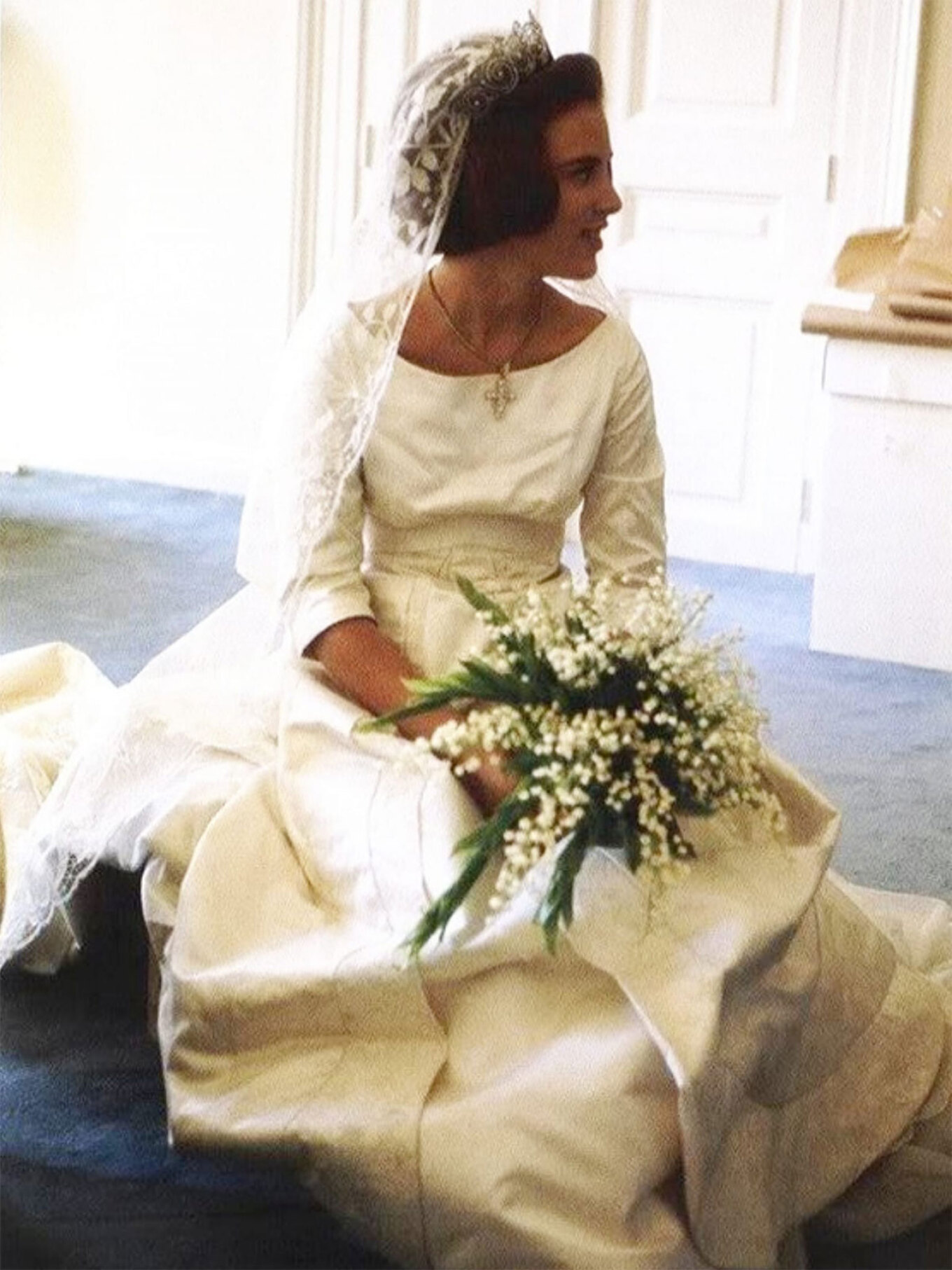 «Στο κεφάλι φορούσε την τιάρα του Χεδίβη της Αιγύπτου, δημιουργία του Καρτιέ που είχαν φορέσει όλες οι πριν απο εκείνην, μετά την μητέρα της, Βασίλισσα Ίνγκριντ της Δανίας απόγονοι, την ημέρα του γάμου τους. Το μακρύ μέχρι το πάτωμα πέπλο ήταν από χειροποίητη Ιρλαδέζικη δαντέλα το κέντημα της οποίας ερχόταν σε αντίθεση με την λιτή γραμμή του φορέματος, στολίζοντας το μοναδικά. Το σχέδιο του νυφικού είχε κρατηθεί επτασφράγιστο μυστικό μέχρι την ημέρα του γάμου....και μετά... μετά όλοι συμφώνησαν ότι ήταν υπέροχο, υπέρκομψο, παραμυθένια μεγαλοπρεπές στην απλότητα του, ιδανικό για μια 18χρονη βασίλισσα με καλό γούστο και σωστή αισθητική.