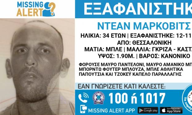 Εξαφανίστηκε από την περιοχή της Θεσσαλονίκης το βράδυ της Κυριακής ο 34χρονος Ντέαν Μάρκοβιτς. «Το Χαμόγελο του Παιδιού» ενημερώθηκε για την εξαφάνιση του σήμερα και προχώρησε στη δημοσιοποίηση των στοιχείων του κατόπιν αιτήματος της οικογένειας του, καθώς ενδέχεται να συντρέχουν λόγοι οι οποίοι θέτουν τη ζωή του σε κίνδυνο.