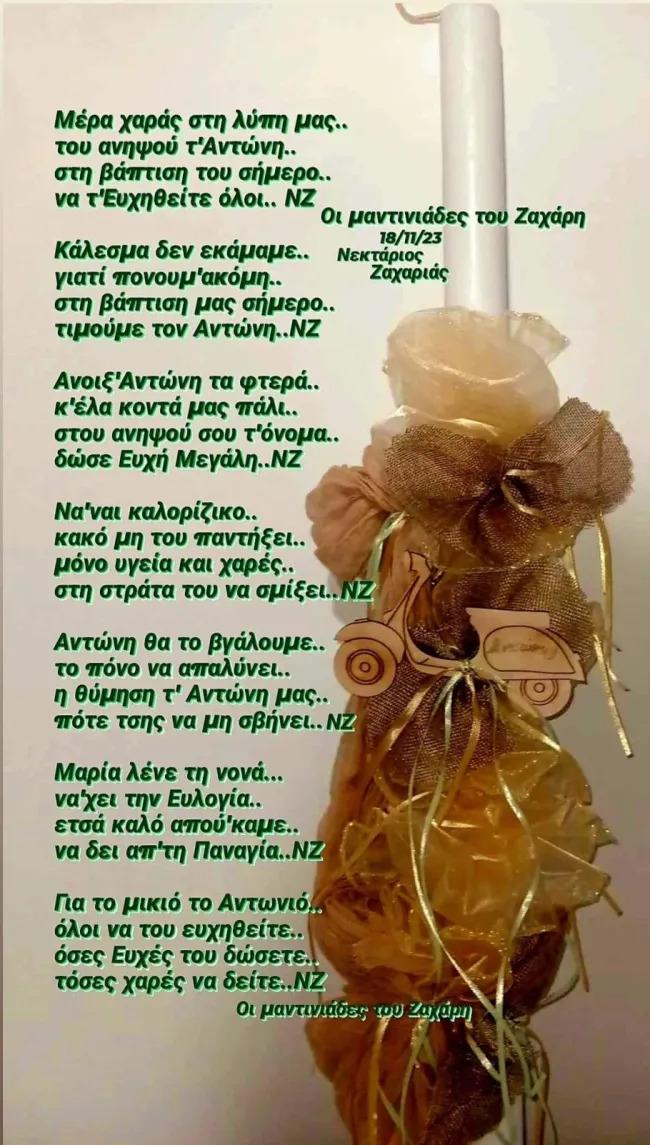 Μάλιστα, ζήτησε από γνωστό μαντιναδολόγο να γράψει μια μαντινάδα για το μυστήριο της βάφτισης που θα γίνει σε κλειστό κύκλο λόγω του πένθους.