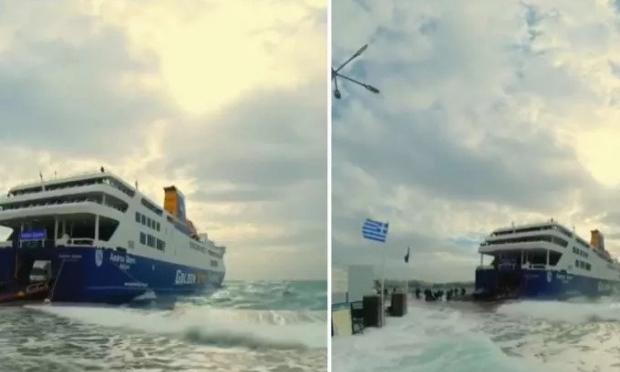 Το πλοίο της γραμμής μόλις έχει δέσει και το βίντεο δείχνει τους επιβάτες με κίνδυνο της ζωής τους να αποβιβάζονται. Αυτοκίνητα και επιβάτες «λούζονται» από τη θάλασσα καθώς τα κύματα «καταπίνουν» τον προβλήτα του λιμανιού.
