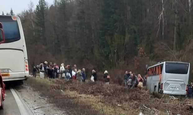 Κοντά στον κόμβο για την πόλη Μπόροβο της Βουλγαρίας, το πούλμαν συγκρούστηκε με φορτηγό, βγήκε από τον δρόμο και κατέληξε σε χαντάκι πέφτοντας σε συστάδα δέντρων.