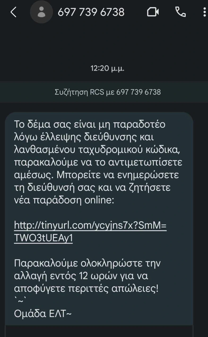 Σύμφωνα με το protothema.gr, όπως φαίνεται σε SMS που εστάλη σήμερα το πρωί σε κινητό τηλέφωνο, οι απατεώνες αφού επαναλαμβάνουν την παγίδα με δήθεν «έλλειψη διεύθυνσης και λανθασμένο ταχυδρομικό κώδικα» στη συνέχεια βάζουν και ένα τελεσίγραφο για την ολοκλήρωση της απάτης.