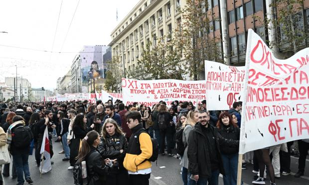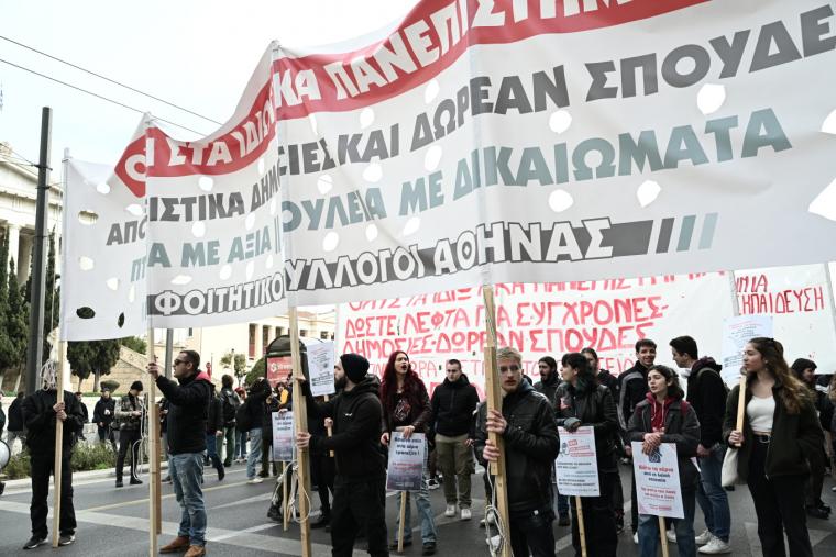 Με πανό που γράφει «Όχι στα ιδιωτικά πανεπιστήμια, αποκλειστικά δημόσιες και δωρεάν σπουδές, πτυχία με αξία, δουλειά με δικαιώματα», οι φοιτητικοί σύλλογοι της Αθήνας συμμετέχουν ενεργά στο συλλαλητήριο.