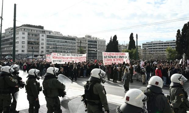 Αντιεξουσιαστές άρχισαν να σπάνε τζαμαρίες από μαγαζιά και φανάρια στην Πατησίων, ενώ έβαλαν και φωτιά σε κάδους στην Στουρνάρη.