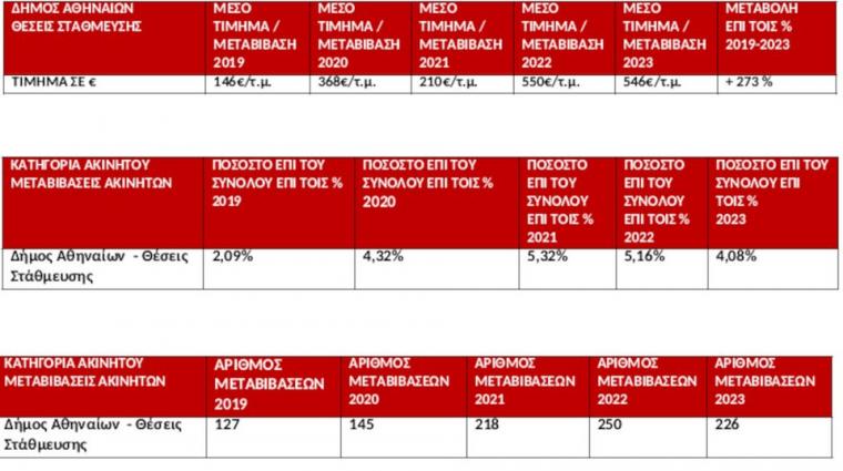 Σύμφωνα με τα στοιχεία της Γενικής Γραμματείας Πληροφοριακών Συστημάτων του Υπουργείου Οικονομικών, που αναλύει σε νέα έκθεση του το E- Real Estates, το 2019 οι μεταβιβάσεις θέσεων στάθμευσης αποτελούσαν το 2,09% (127 μεταβιβάσεις) του συνόλου των μεταβιβάσεων, το 2020 το 4,32% (137 μεταβιβάσεις), το 2021 το 5,32% (209 μεταβιβάσεις) του συνόλου, το 2022 το 5,16% (250 μεταβιβάσεις) επί του συνόλου και το 2023 το 4,08% με 226 μεταβιβάσεις. Το μέσο τίμημα ανά μεταβίβαση από 146€/τ.μ. που ήταν το 209 πλέον διαμορφώνεται στα 546€/τ.μ., συμφωνα με το iefimerida.gr