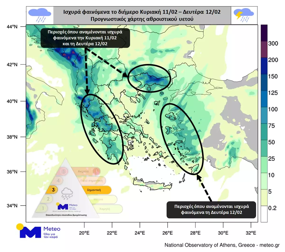 Τη Δευτέρα (12.02.2024) η κακοκαιρία αρχικά θα συνεχιστεί σε μεγάλο μέρος της χώρας. Προοδευτικά τα ισχυρά φαινόμενα θα εντοπίζονται κυρίως στην Κεντρική και Ανατολική Μακεδονία, στη Θράκη και στα νησιά του Βόρειου και Βορειοανατολικού Αιγαίου, όπου κατά τόπους αναμένονται μεγάλα ύψη βροχής.