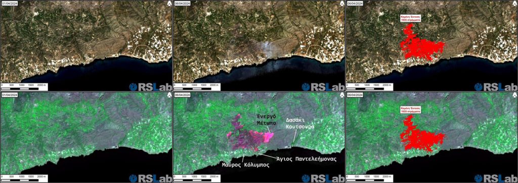 Στις δορυφορικές εικόνες που ακολουθούν, απεικονίζεται η περιοχή πριν και μετά την πυρκαγιά, στα χρώματα του ορατού και του κοντινού υπέρυθρου.