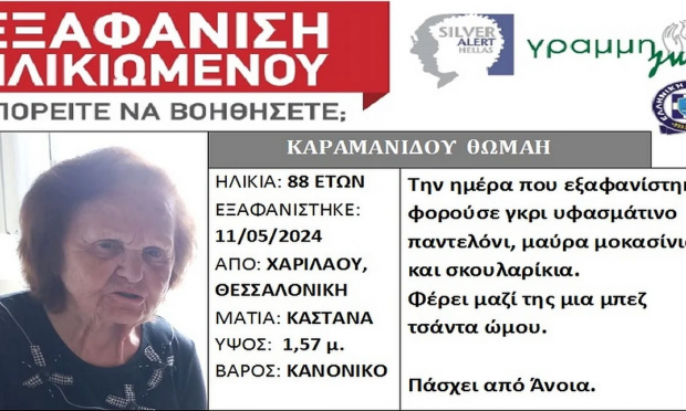Σύμφωνα με τη Γραμμή Ζωής, πρόκειται για την Καραμανίδου Θωμαή, 88 ετών, η οποία εξαφανίστηκε από το σπίτι της, στην περιοχή Χαριλάου, Θεσσαλονίκης, την 11/05/24.