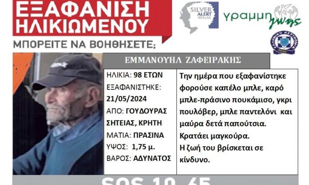 Σύμφωνα με τη Γραμμή Ζωής, ο Εμμανουήλ Ζαφειράκης, 98 ετών, εξαφανίστηκε από το σπίτι του γιού του, στο οποίο φιλοξεμνούνταν, στην περιοχή Γούδουρας Σητείας, στην Κρήτη, το πρωί της 21/05/24.