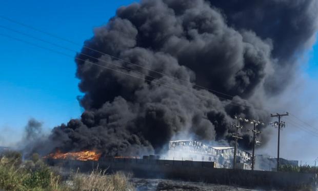 Οι πυκνοί μαύροι καπνοί έχουν καλύψει την ευρύτερη περιοχή, καθώς καίγεται εργοστάσιο με χημικά. Νωρίτερα, καίγονταν διάφορα υλικά που υπάρχουν στον περιβάλλοντα χώρο εργοστασίου ανακύκλωσης απέναντι από το εργοστάσιο Παπουτσάνης, το οποίο δεν βρίσκεται σε κίνδυνο.