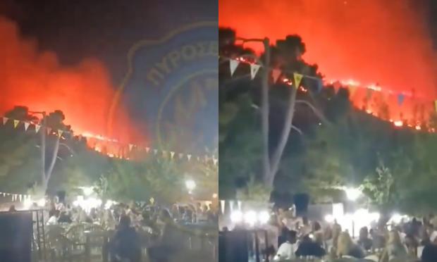 Ειδικότερα, στο βίντεο που έχει δημοσιευτεί στη σελίδα Forecast Weather Greece, φαίνεται κόσμος να συνεχίζει να διασκεδάζει σε πανηγύρι, την ώρα που η φωτιά έκαιγε ανεξέλεγκτα στο δάσος ακριβώς από πίσω τους.