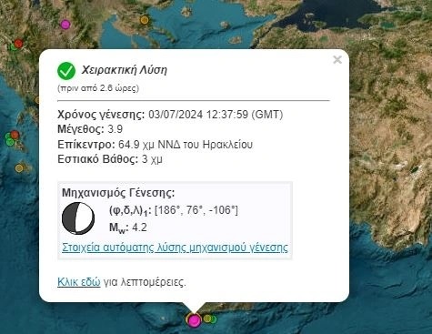 Σύμφωνα με την αναθεωρημένη λύση του Γεωδυναμικού Ινστιτούτου το επίκεντρο του σεισμού εντοπίζεται 64,9 χιλιόμετρα νοτιοδυτικά του Ηρακλείου, στην Κρήτη, με εστιακό βάθος 3 χιλιόμετρα.