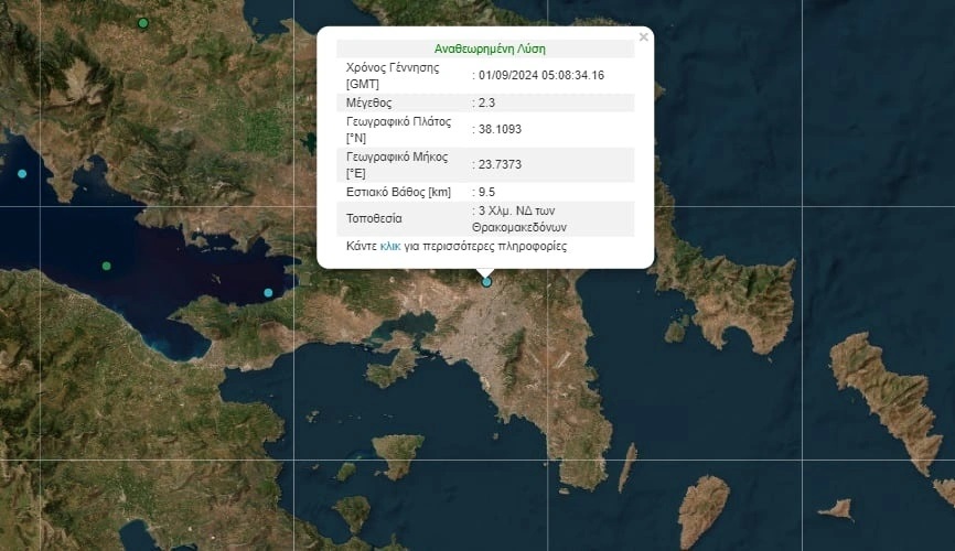 Σεισμός μεγέθους 2,3 βαθμών της κλίμακας Ρίχτερ με επίκεντρο τους Θρακομακεδόνες έγινε αισθητός, το πρωί της Κυριακής 1 Σεπτεμβρίου στην Αθήνα.