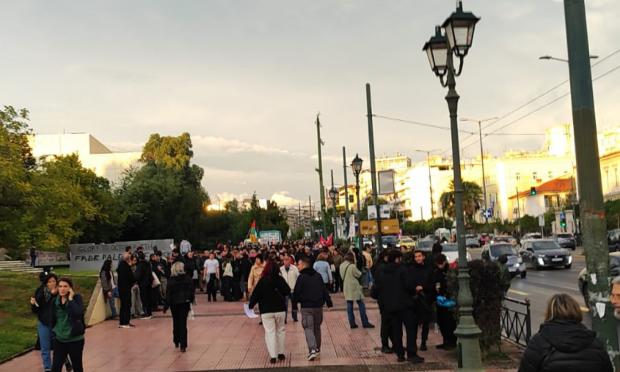 Οι συγκεντρωμένοι διαμαρτύρονται για την Παλαιστίνη αλλά και τον εργασιακό νόμο δίπλα από το μέγαρο.