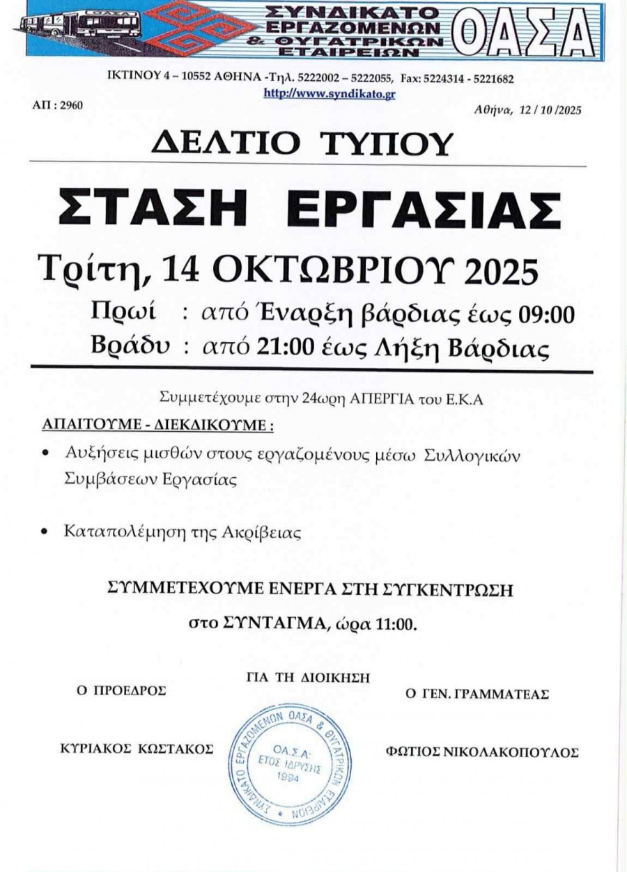 Την Τρίτη 14 Οκτωβρίου, το επιβατικό κοινό της Αθήνας θα έρθει αντιμέτωπο με δυσκολίες στις μετακινήσεις λόγω πανελλαδικής 24ωρης απεργίας που κήρυξε η ΑΔΕΔΥ ενάντια στο νέο εργασιακό νομοσχέδιο. Oι εργαζόμενοι στα λεωφορεία του ΟΑΣΑ πραγματοποιούν στάσεις εργασίας από την έναρξη της βάρδιας έως τις 09:00 και από τις 21:00 μέχρι τη λήξη.