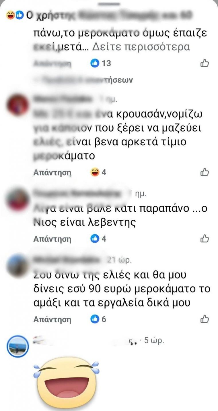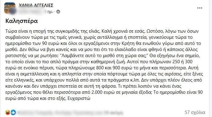 Η ανάρτηση έχει ήδη ξεπεράσει τα 57 σχόλια, με τη συζήτηση να συνεχίζεται έντονα και να αντικατοπτρίζει τη δυσκολία που βιώνουν τόσο οι εργάτες όσο και οι ελαιοπαραγωγοί ενόψει της φετινής – και περιορισμένης – συγκομιδής.