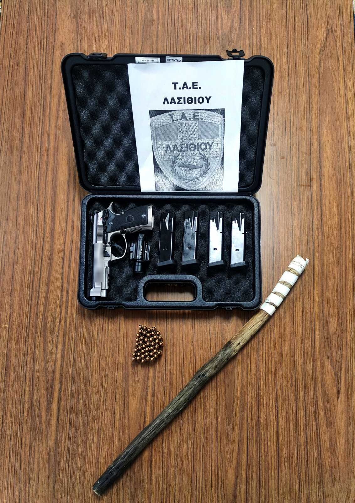 Χειροπέδες σε έναν 37χρονο και μία 39χρονη πέρασαν αστυνομικοί του Τμήματος Αστυνομικών Επιχειρήσεων Λασιθίου, που κατηγορούνται για παραβάσεις της νομοθεσίας περί όπλων.