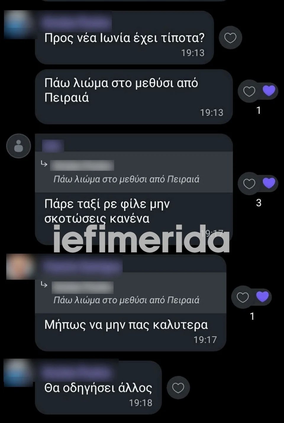 Στην επίμαχη συνομιλία, ένας χρήστης ζητάει πληροφορίες για το αν υπάρχει μπλόκο της Τροχαίας προς Νέα Ιωνία, καθώς βρίσκεται στον Πειραιά και είναι «λιώμα από το μεθύσι».